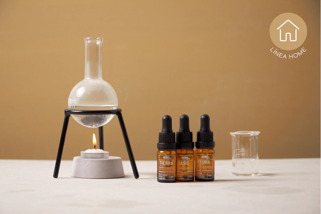 Nos inspiramos en el laboratorio, los procesos químicos y la alquimia para armar un difusor lleno de estilo donde el fuego, el aire y el agua te llevarán por un viaje a la aromaterapia.